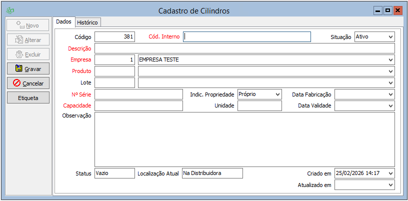 - Localização Atual: Localização física atual do cilindro (Na Distribuidora, No Fornecedor, No Cliente, No Vendedor)