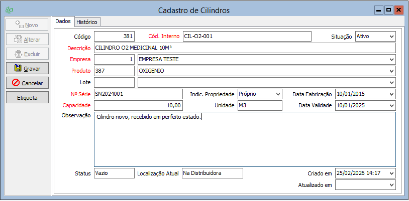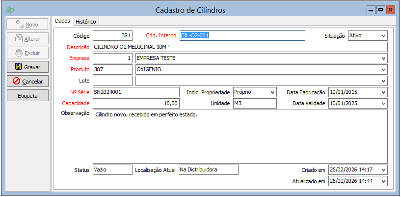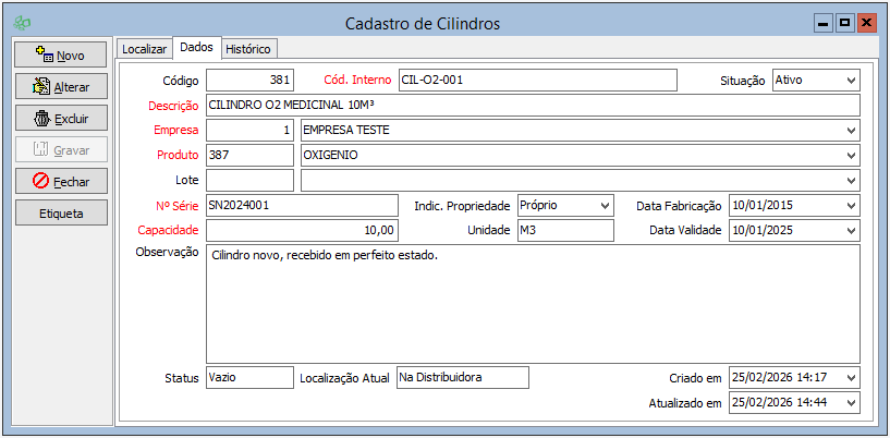 - Status: Situação operacional do cilindro (Cheio ou Vazio)