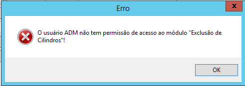 - Sem esta permissão: O sistema exibe mensagem informando que você não possui permissão Exclusão de Cilindros e bloqueia a ação