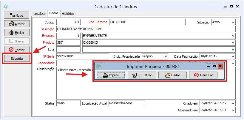 - Gere etiquetas imediatamente após cadastrar novos cilindros