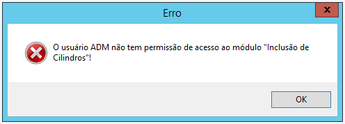 - Sem esta permissão: O sistema exibe mensagem informando que você não possui permissão Inclusão de Cilindros e bloqueia a ação