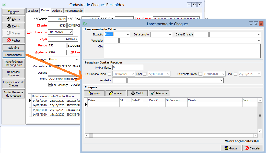 Através desse, é possível realizar todas as movimentações do cheque, sendo que as mesas irão ocorrer através do botão Lançamentos: