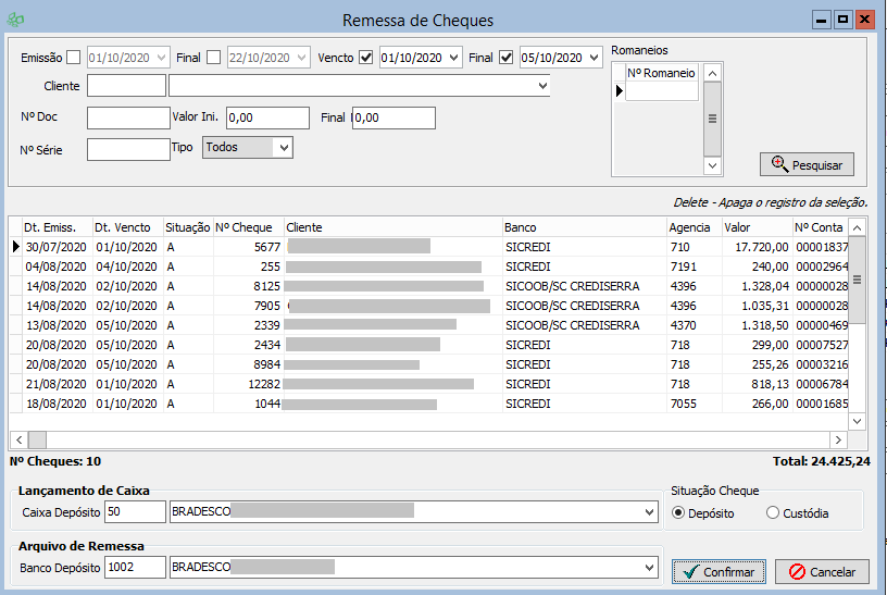Caso o banco com o qual trabalha disponha do recurso, é possível gerar um arquivo de remessa com os cheques que serão enviados ao banco para depósito ou custódia.
