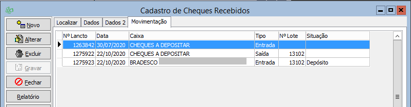 As movimentações de cada cheque podem ser visualizadas no cadastro do mesmo, na aba Movimentações.