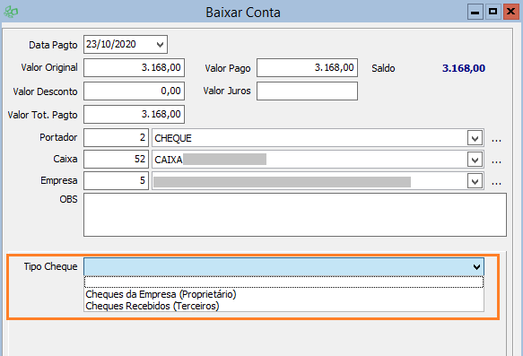 No cadastro de contas a pagar, ao baixar a conta e informar o portador cheque, um campo permite selecionar se será utilizado um cheque emitido recebido ou um cheque da empresa.