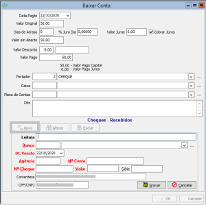 Sempre que for feita baixar com cheque, o sistema exibirá na tela o local para que sejam informados os cheques usados no pagamento daquela conta: