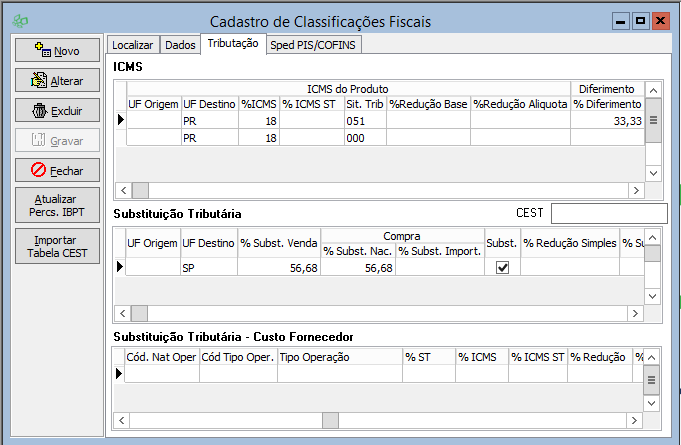 O percentual de diferimento deve ser informado ou no Cadastro do Produto ou no Cadastro da Classificação Fiscal.