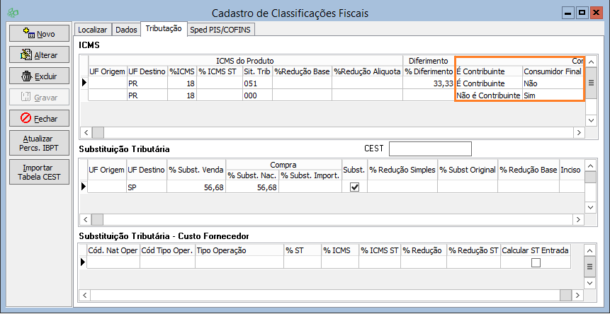 Quando for emitida uma nota para consumidor final e não contribuinte, se for enviado o diferimento, a nota será rejeitada pelo SEFAZ, sendo assim, temos que definir uma segunda configuração, informando se é contribuinte e consumidor e criar uma segunda linha dizendo que, quando por consumidor final e não contribuinte, deverá buscar outra situação tributária.