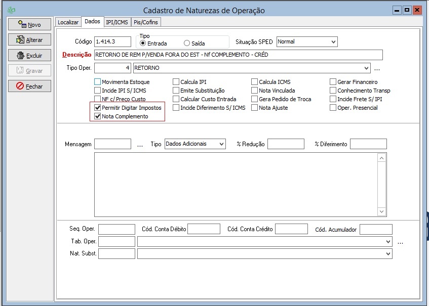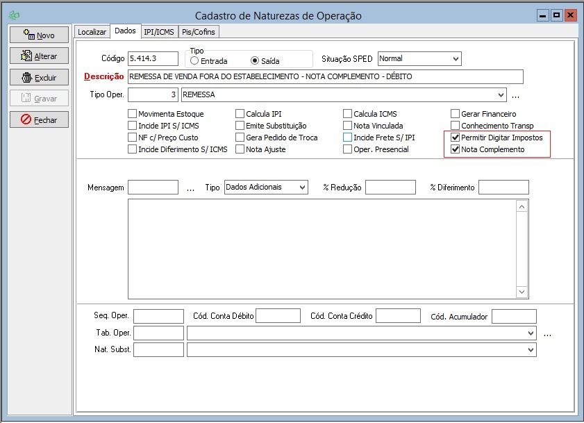 CFOP para Nota de Complemento de Imposto (débito):