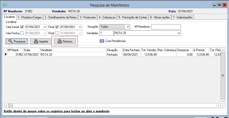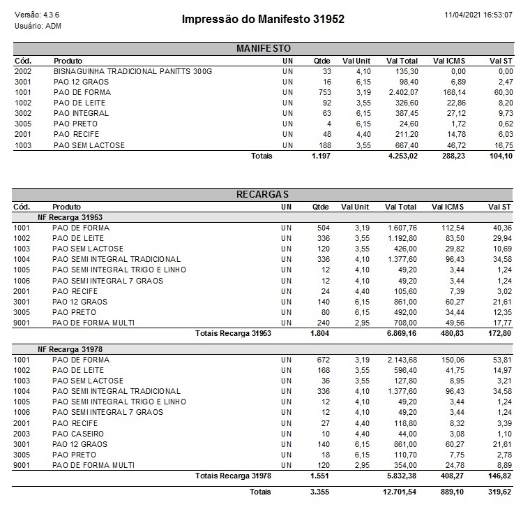 Em Cadastros J-Z → Manifestos foi incluso um relatório onde é possível identificar em quais notas de venda há diferença de preço com o Manifesto, bem como todos os produtos, quantidade e valores informados no Manifesto, Recargas, Vendas, Retornos e Notas Complementares.