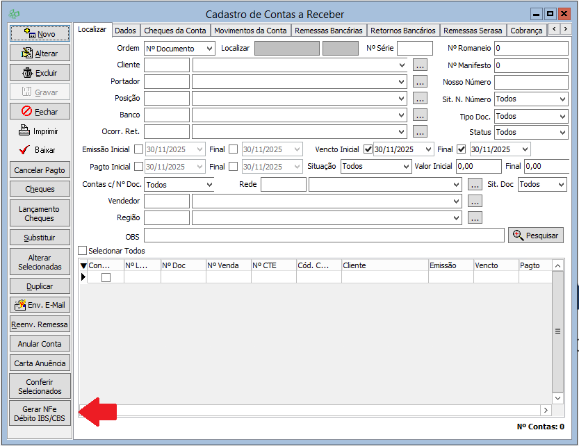Tela de Contas a Receber — “Gerar NF-e Débito IBS/CBS”