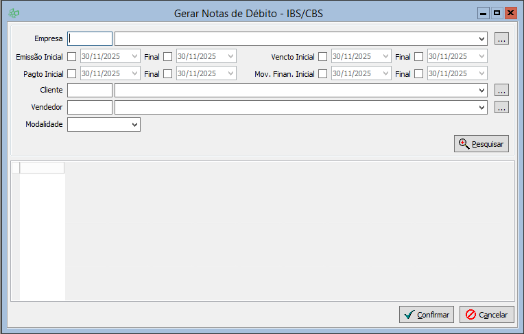 Ao clicar em , a tela: Gerar Notas de Débito – IBS/CBS será aberta