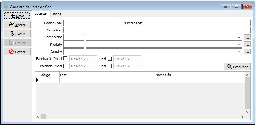 A tela do Cadastro de Lotes de Gás será aberta