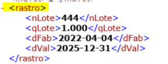 No XML encontrará as informações nas tags 'RASTRO' dentro de cada item da NF: