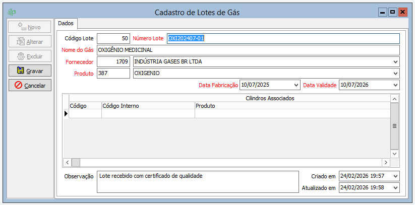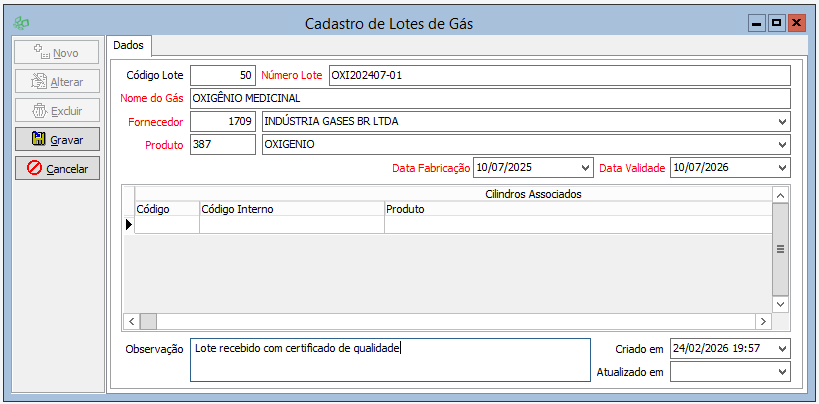 3. No cadastro de cilindros, selecione o lote ao preencher o cilindro