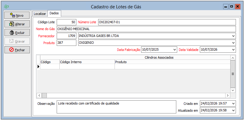 • Você não conseguirá cadastrar um novo lote de gás no sistema