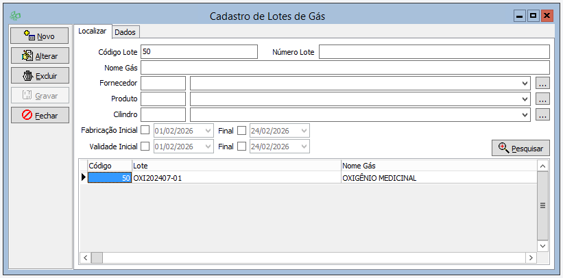 • Ao clicar na opção "Lotes de Gás" no menu do sistema para abrir o cadastro