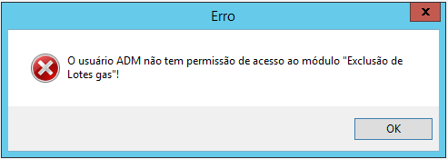 • Se o botão "Excluir" estiver desabilitado ou não funcionar, você receberá uma mensagem de erro explícita, indicando que o usuário não tem permissão de exclusão (Exclusão de Lotes Gás)