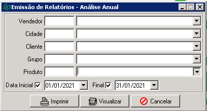 Data Inicial e Final - Campo do tipo Data para preenchimento de um intervalo de dias. O preenchimento deste campo filtrará as vendas apenas dentro desse período e servirá para detalhamento dos meses dentro do relatório.