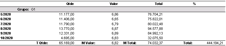A finalidade desse relatório é exibir o desempenho mês a mês, por grupo de produto de acordo com a data selecionada no filtro. Traz informações como quantidade vendida, valor médio do item e valor total dentro daquele mês.